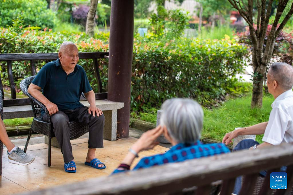 Senior residents chat at a social welfare center in Hanshou County of Changde City, central China's Hunan Province, June 20, 2023.