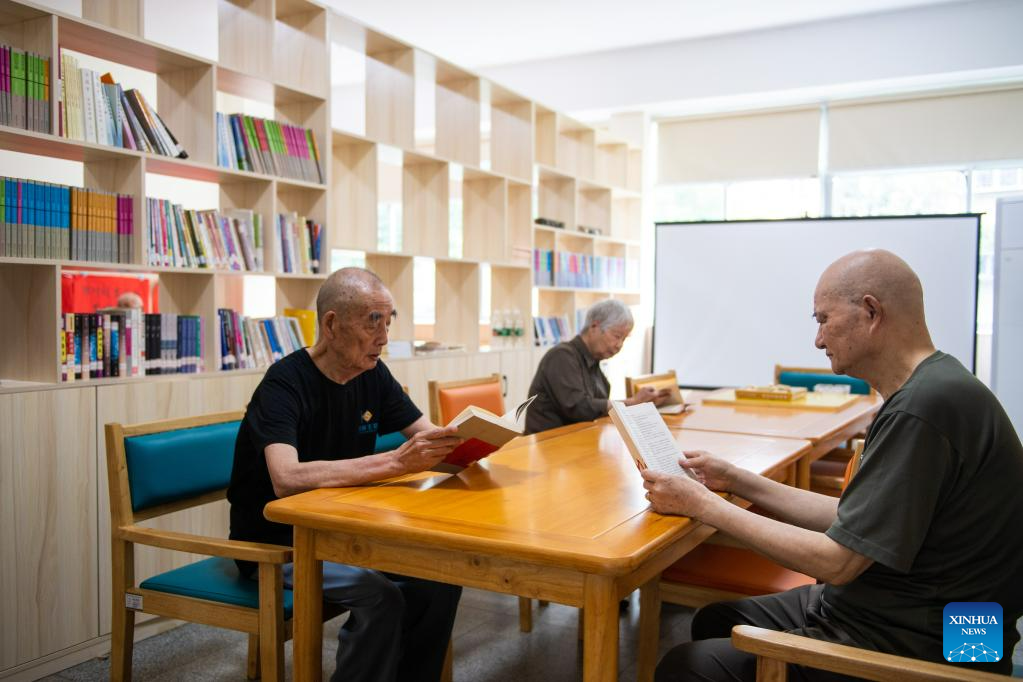 Senior residents read at a nursing home in Hanshou County of Changde City, central China's Hunan Province, June 20, 2023.