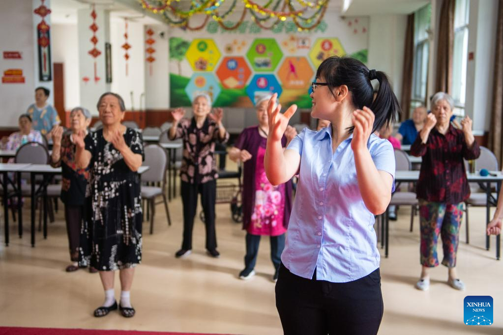 Senior residents dance following the guidance of a staff member at a social welfare center in Hanshou County of Changde City, central China's Hunan Province, June 20, 2023.