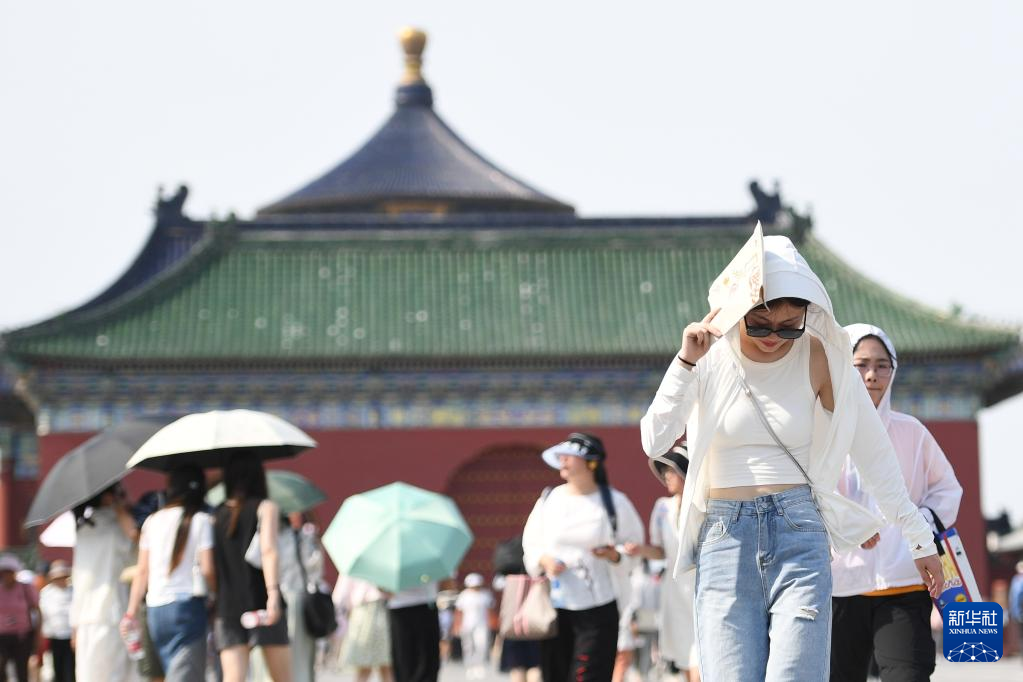 Tourists shield themselves from the sunshine with umbrellas at the Temple of Heaven in Beijing, capital of China, June 23, 2023. Beijing issued a red alert for high temperature at 7 a.m. Friday. (Xinhua/Ju Huanzong)