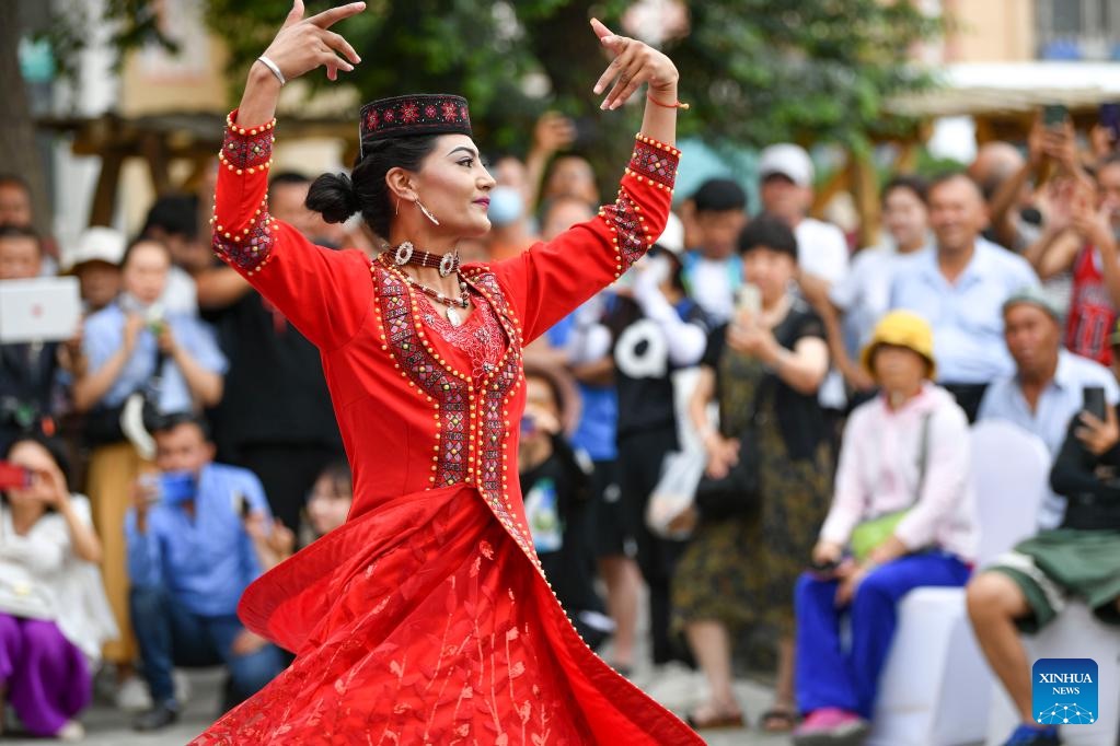 An artist performs a show of intangible cultural heritage in the ancient city of Kashgar scenic area in Kashgar, northwest China's Xinjiang Uygur Autonomous Region, June 14, 2023. (Xinhua/Hu Huhu)