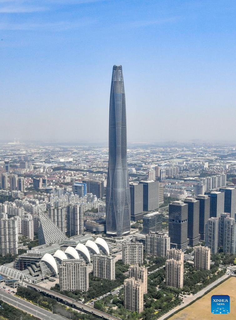 This aerial view taken on June 16, 2023 shows a view of the 530-meter Tianjin Chow Tai Fook Finance Centre (CTF) at the Binhai New Area in north China's Tianjin Municipality. (Xinhua/Sun Fanyue)