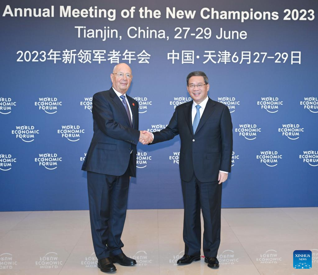 Chinese Premier Li Qiang meets with Executive Chairman of the World Economic Forum (WEF) Klaus Schwab in north China's Tianjin, June 26, 2023. (Xinhua/Yue Yuewei)
