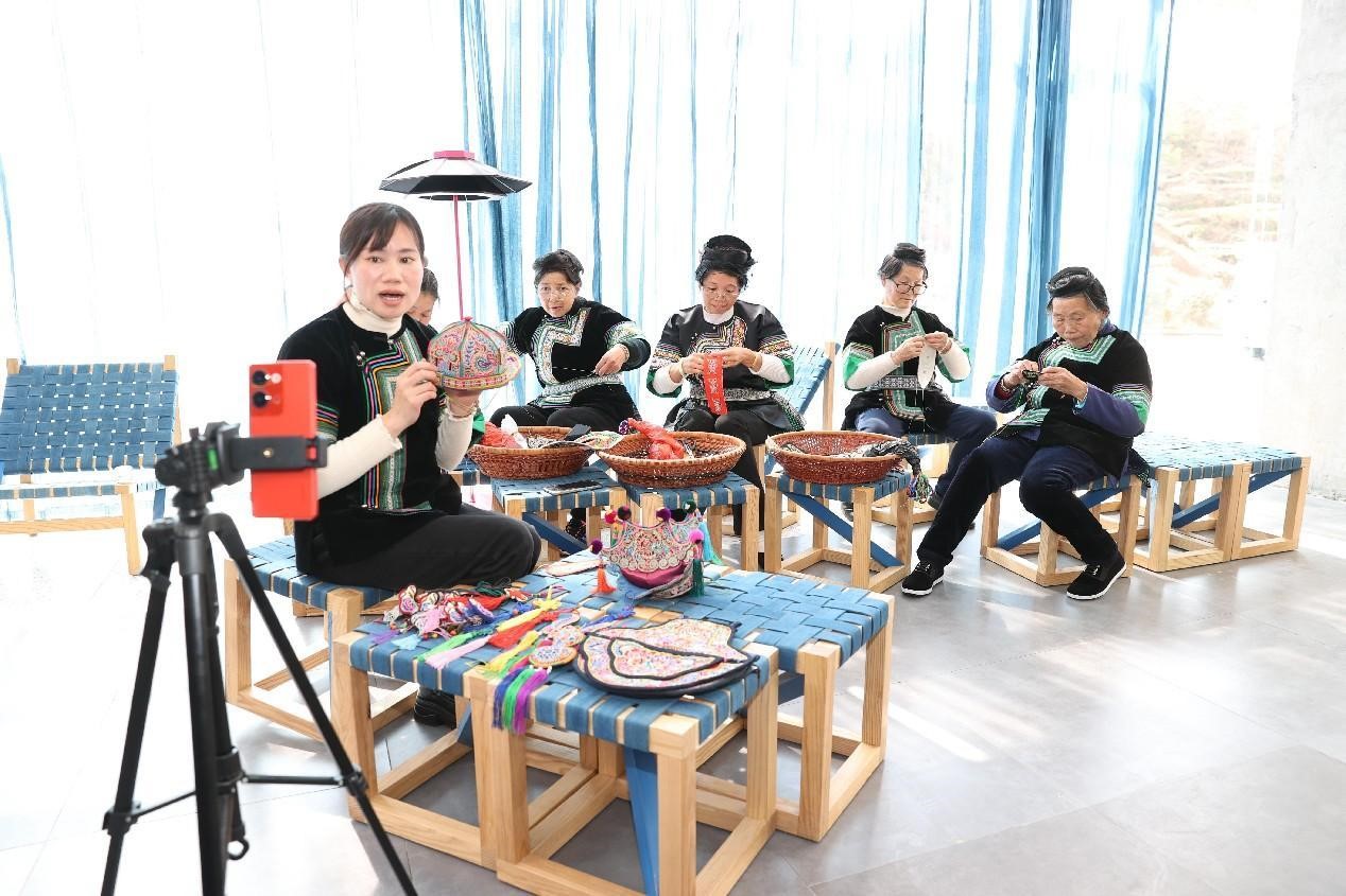 Women sell embroidery products via livestreaming in Rongjiang county, Qiandongnan Miao and Dong autonomous prefecture, southwest China's Guizhou province. (People's Daily Online/Zhang Kai)