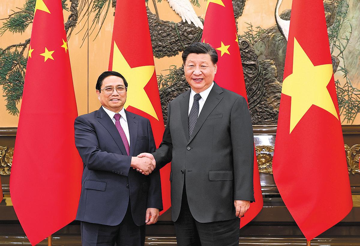 President Xi Jinping shakes hands with Prime Minister of Vietnam Pham Minh Chinh at the Great Hall of the People in Beijing on Tuesday. PHOTO BY WANG ZHUANGFEI / CHINA DAILY