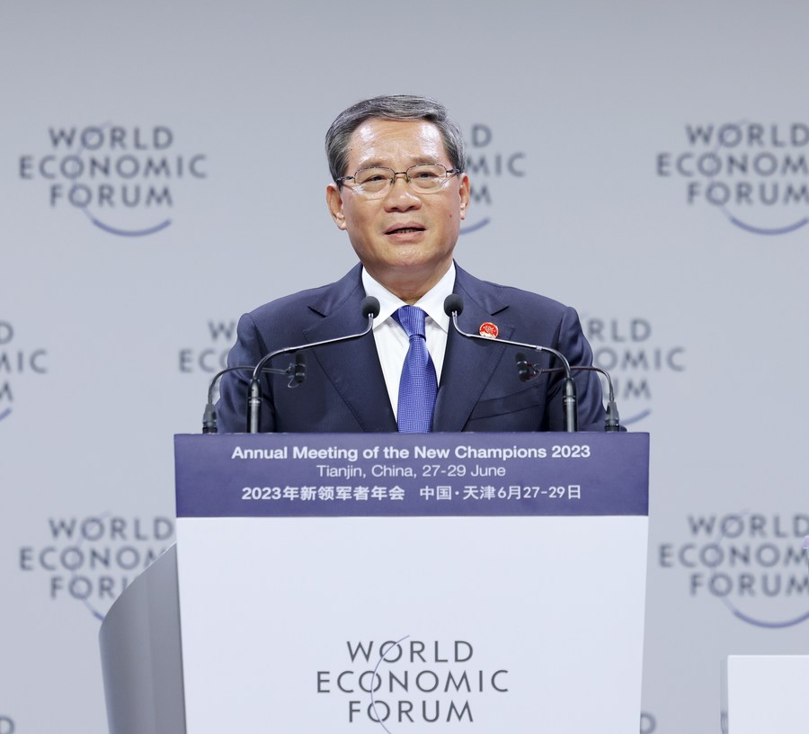 Chinese Premier Li Qiang addresses the opening of the 14th Annual Meeting of the New Champions, also known as the Summer Davos, in north China's Tianjin Municipality, June 27, 2023. (Xinhua/Wang Ye)