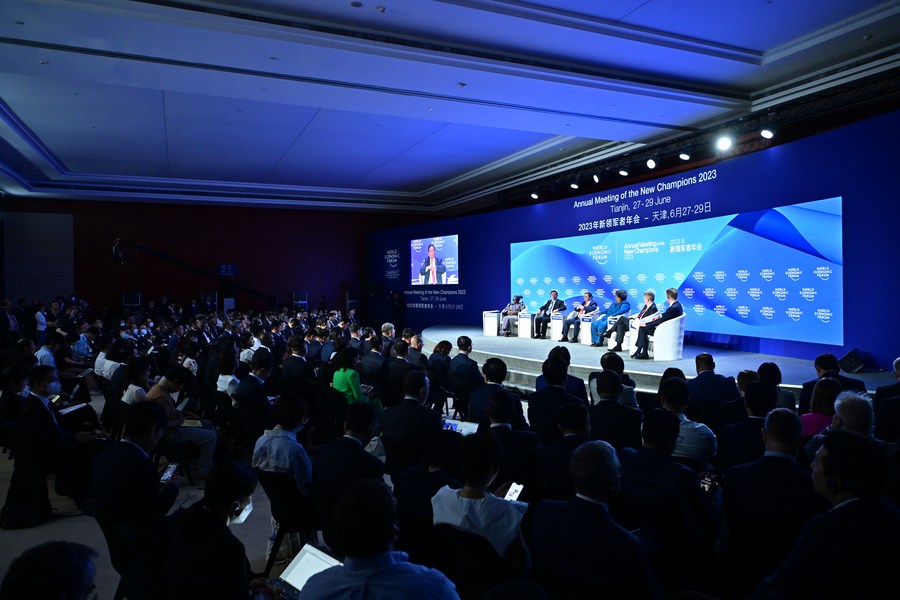 This photo taken on June 27, 2023 shows the opening ceremony of the 14th Annual Meeting of the New Champions, also known as the Summer Davos, in north China's Tianjin Municipality. (Xinhua/Zhao Zishuo)
