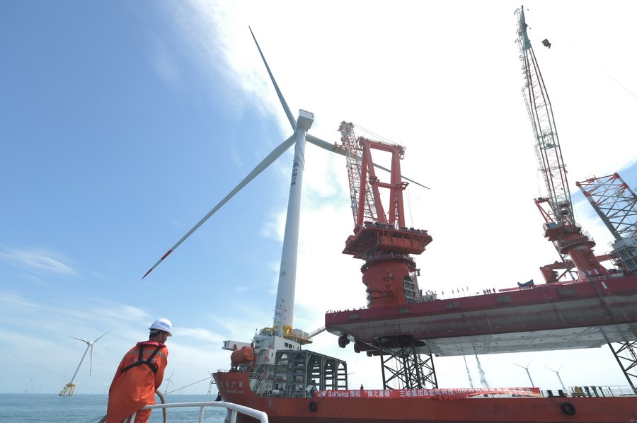 This photo shows the construction site of the world's first 16-megawatt offshore wind turbine in Fuzhou, southeast China's Fujian Province, June 28, 2023. (Xinhua/Lin Shanchuan)