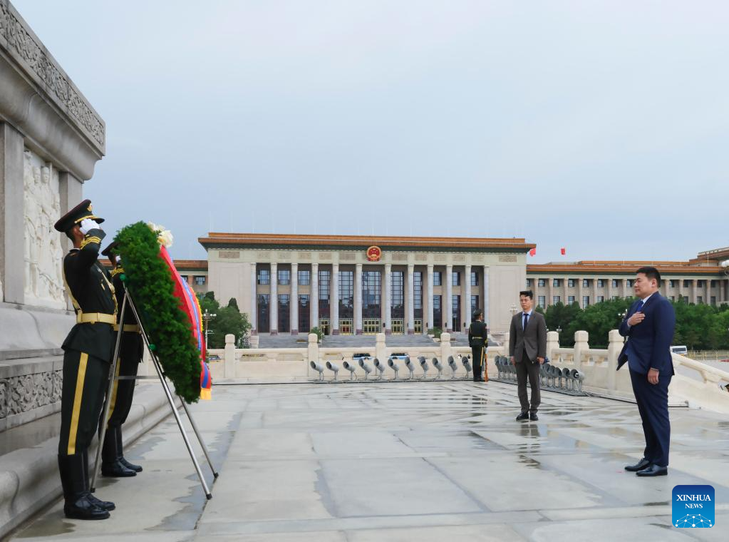 Mongolian Prime Minister Luvsannamsrai Oyun-Erdene lays a wreath at the Monument to the People's Heroes on the Tian'anmen Square in Beijing, capital of China, June 28, 2023. (Xinhua/Ding Lin)