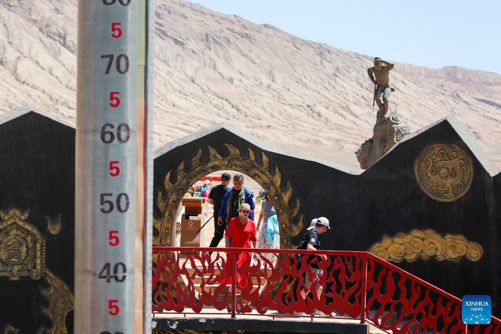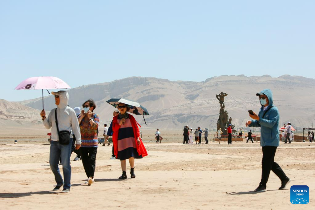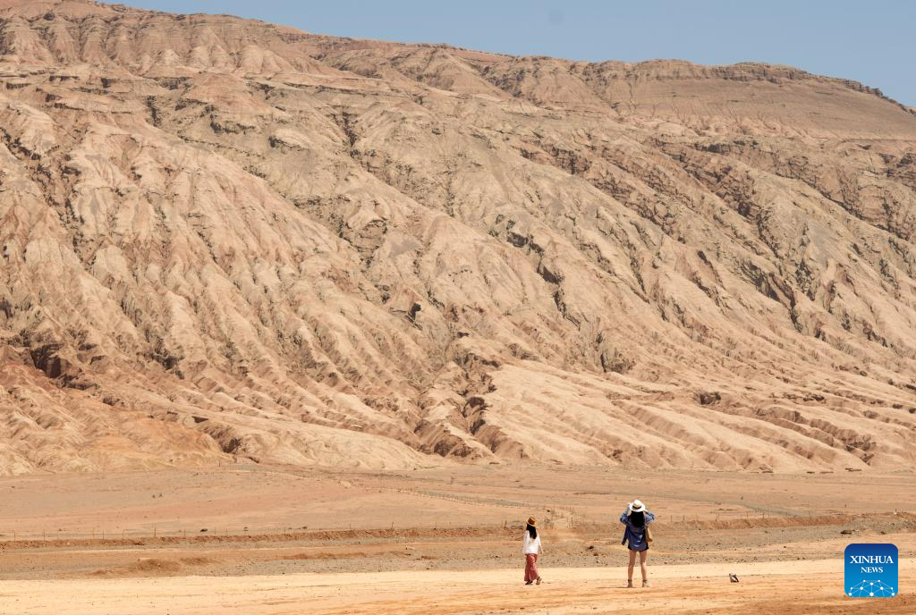 Tourists visit the Flaming Mountain scenic area in Turpan, northwest China's Xinjiang Uygur Autonomous Region, June 27, 2023.