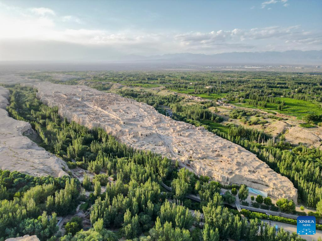 This aerial photo taken on June 25, 2023 shows the Jiaohe Ruins, a world cultural heritage site, in Turpan, northwest China's Xinjiang Uygur Autonomous Region.