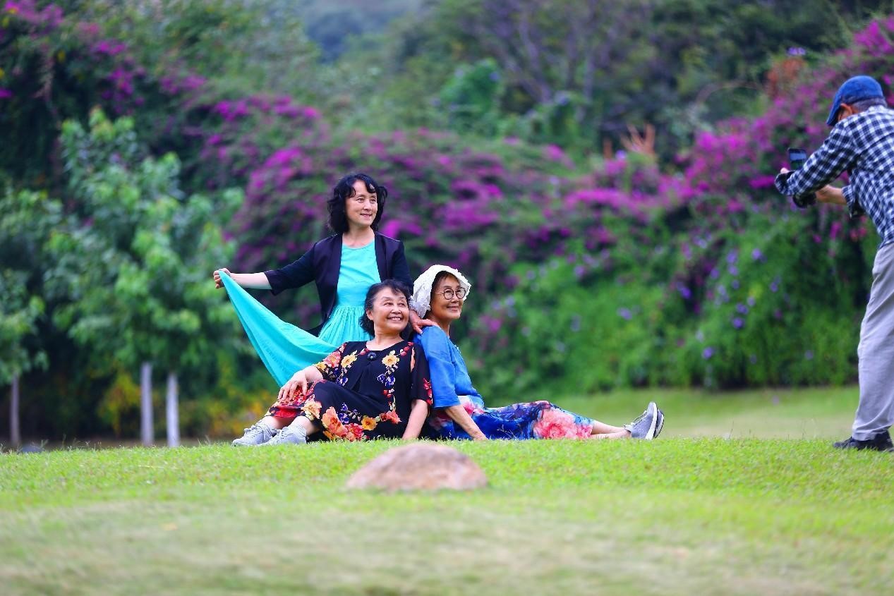 Senior tourists pose for pictures in the Nanshan Cultural Tourism Zone, Sanya, south China's Hainan province. (People's Daily Online/Chen Wenwu)