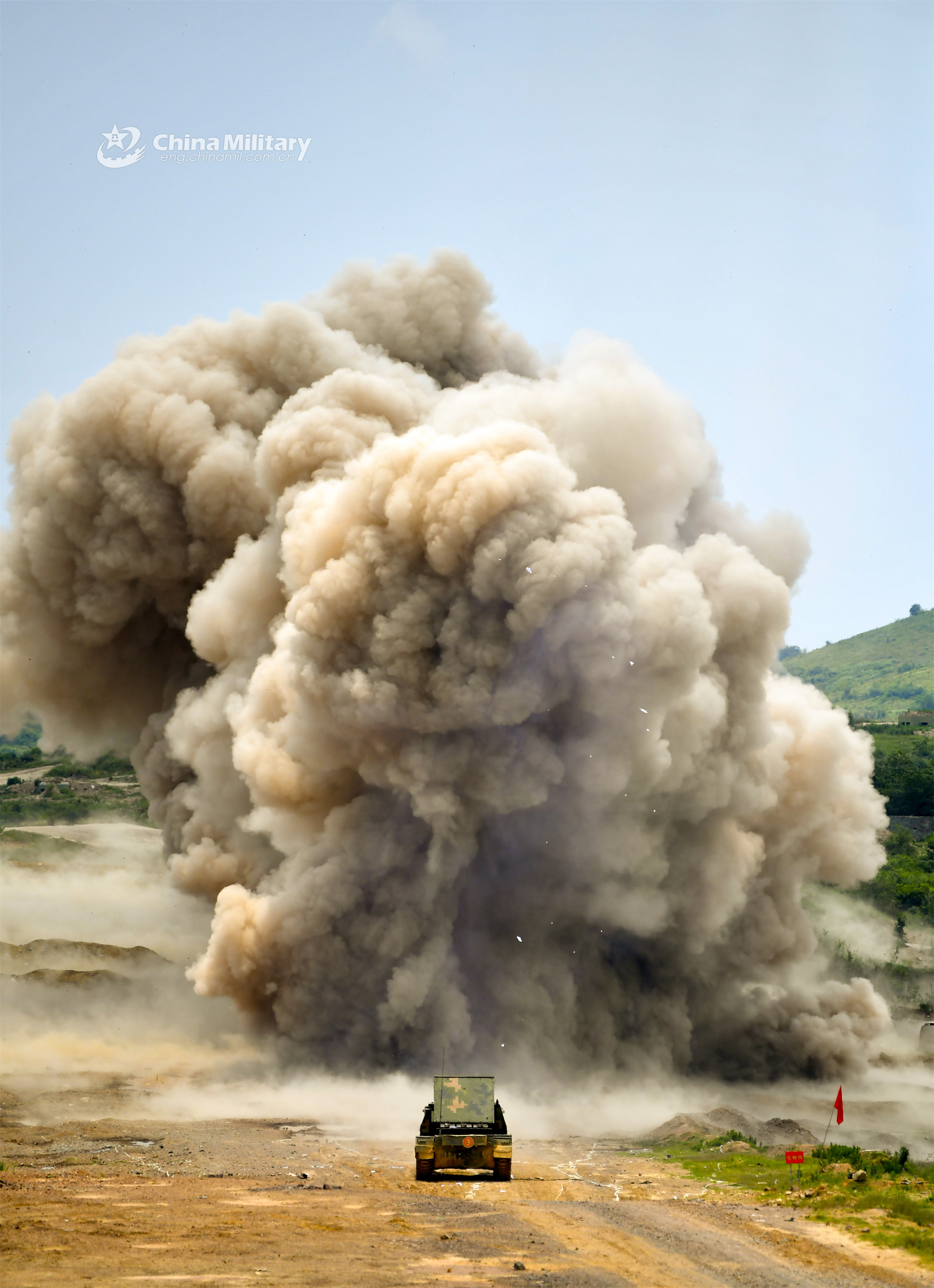 Mine-clearing vehicle attached to a combined-arms brigade under the PLA 71st Group Army detonates explosives to clear the path during explosive ordnance disposal training on June 18, 2023. (eng.chinamil.com.cn/Photo by Yao Zongkai)