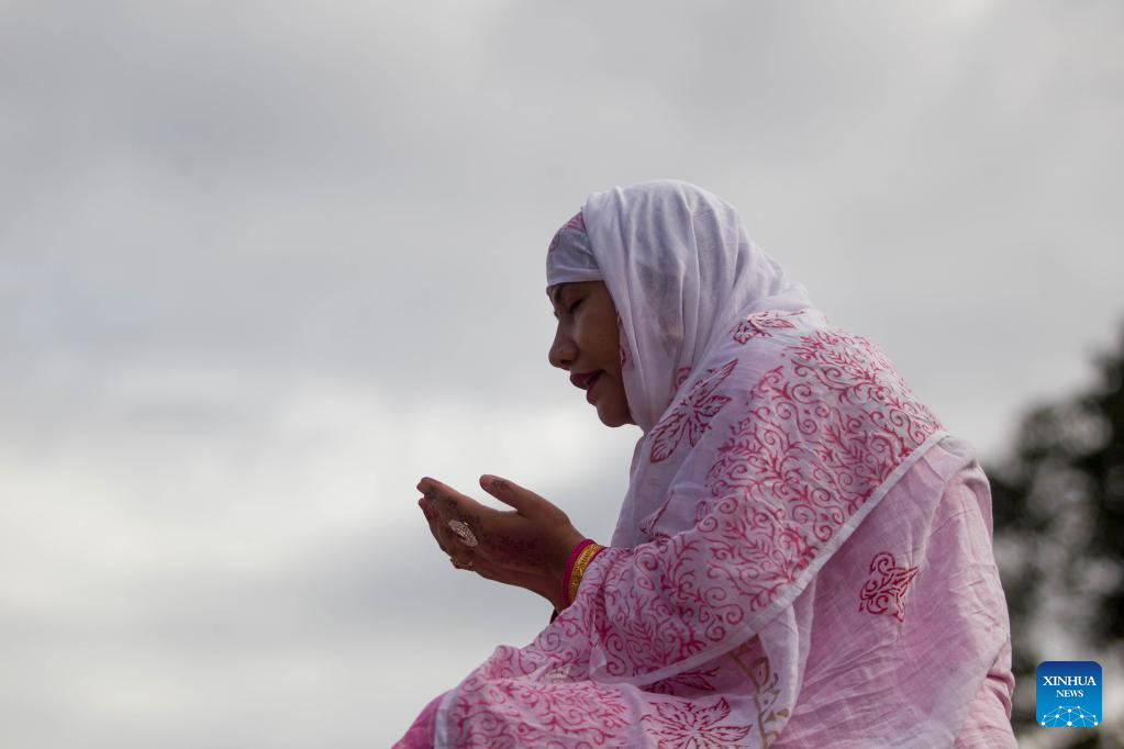 A woman prays during the Muslim festival of Eid al-Adha, or the Feast of Sacrifice, in Kathmandu, Nepal, June 29, 2023. (Photo by Sulav Shrestha/Xinhua)