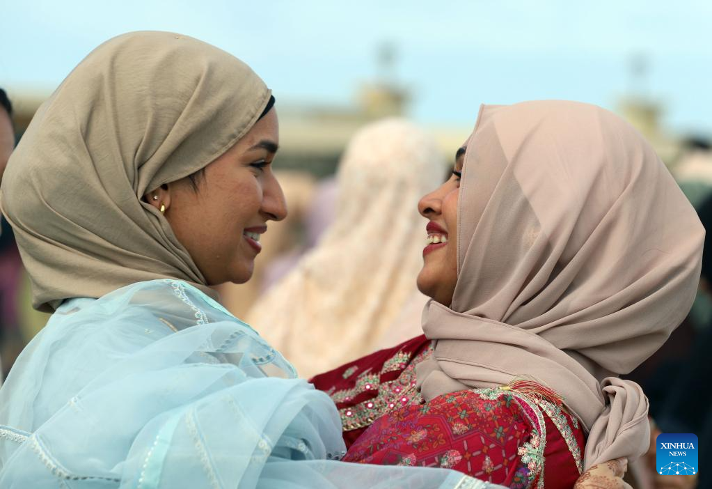 People greet each other after the Eid al-Adha prayer at Galle Face Green in Colombo, Sri Lanka, on June 29, 2023. (Photo by Ajith Perera/Xinhua)