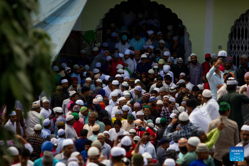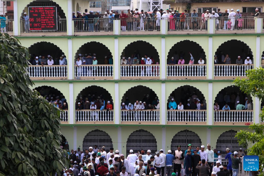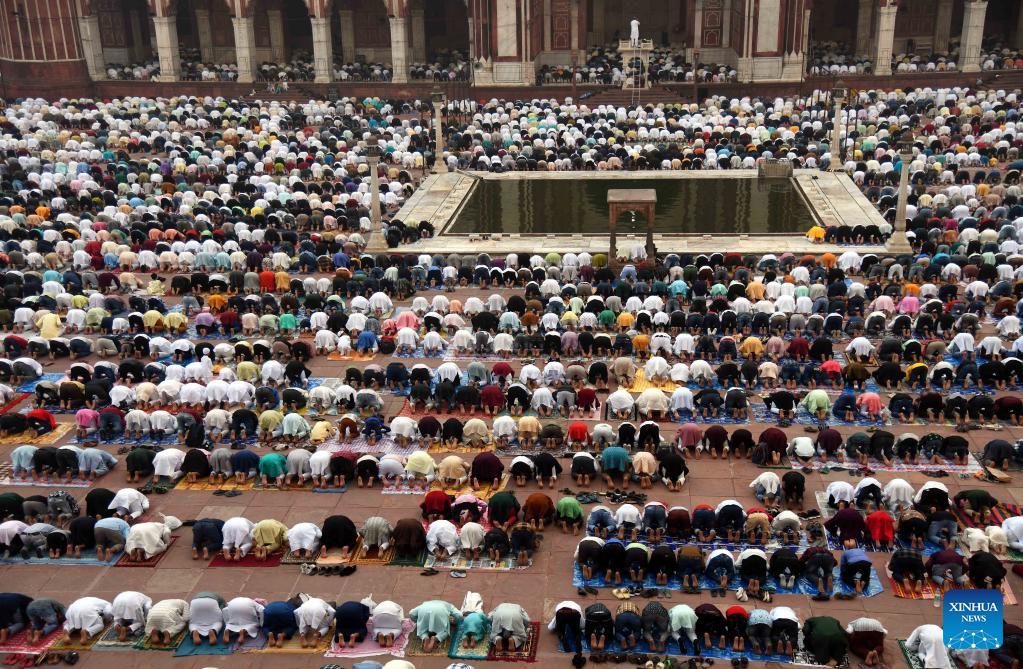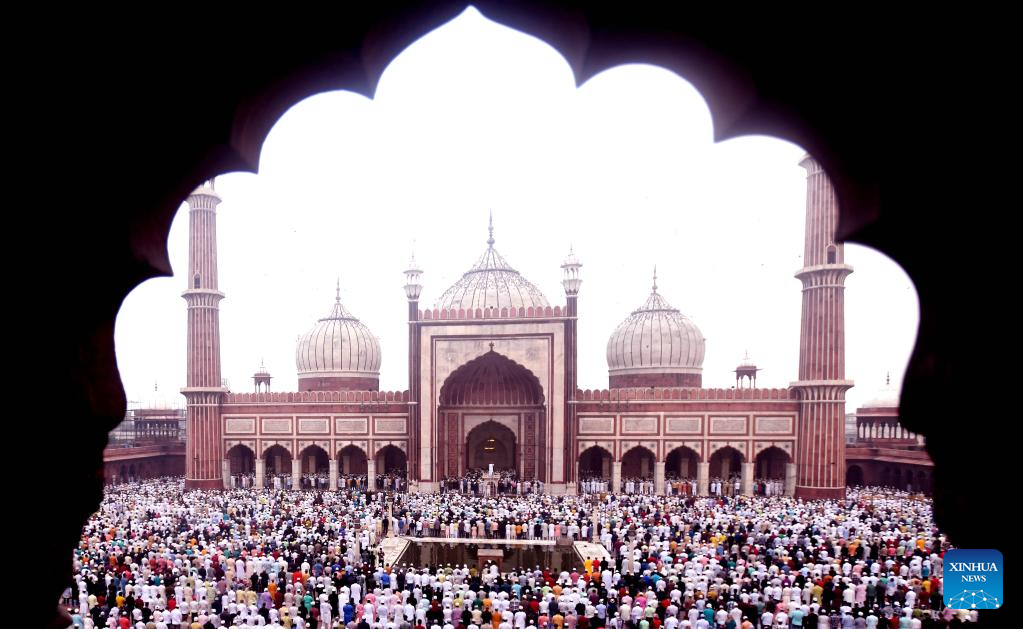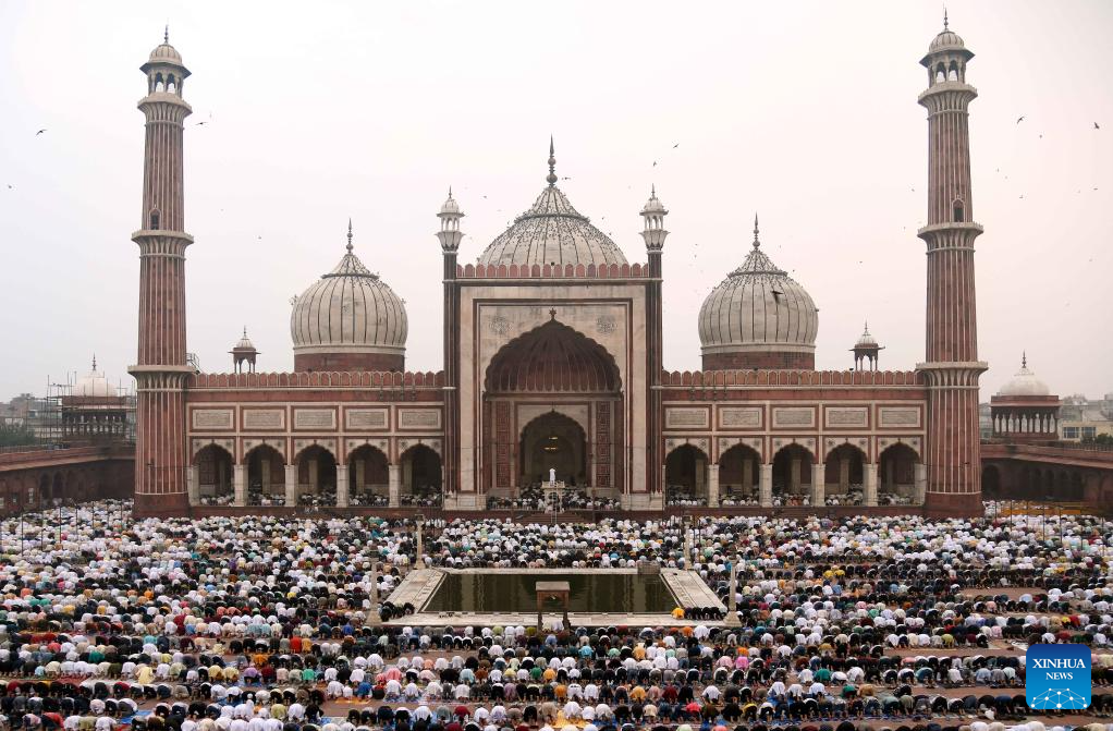 People offer Eid Al-Adha prayers at a grand mosque in New Delhi, India, June 29, 2023. (Str/Xinhua)