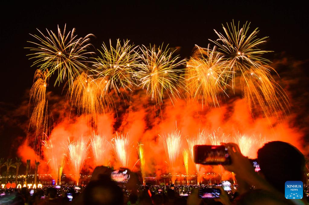 Fireworks light up the sky over Lusail Boulevard during celebrations of the Eid al-Adha festival in Lusail, Qatar, June 28, 2023. (Photo by Nikku/Xinhua)