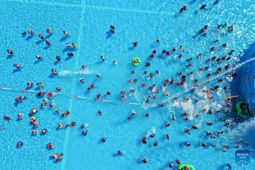 This aerial photo taken on June 28, 2023 shows people playing at a water amusement park in Yangzhou, east China's Jiangsu Province. (Photo by Meng Delong/Xinhua)