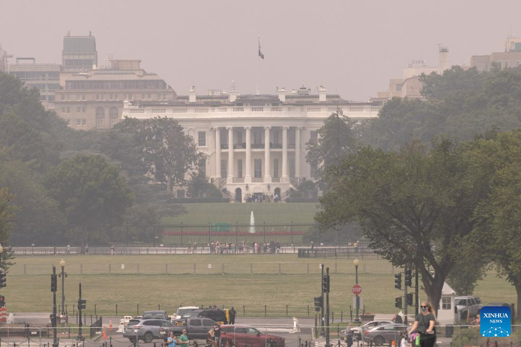The White House is shrouded in haze in Washington, D.C., the United States, on June 29, 2023. (Photo by Aaron Schwartz/Xinhua)