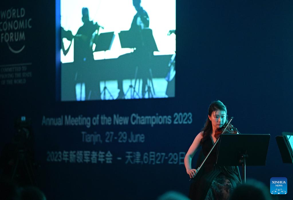 An artist performs at the closing concert of the 14th Annual Meeting of the New Champions, also known as the Summer Davos, in north China's Tianjin Municipality, June 29, 2023. (Xinhua/Zhao Zishuo)
