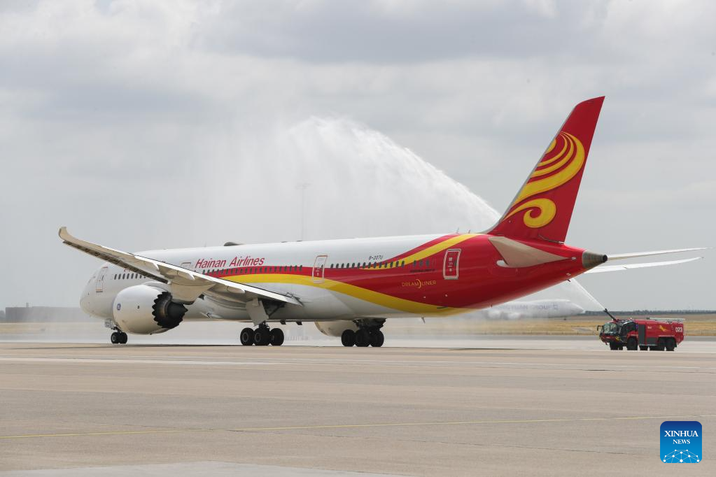 Hainan airlines HU760 flight receives a water salute before taking off for Shenzhen at Brussels Airport in Zaventem, Belgium, June 28, 2023. A ceremony was held for China's Hainan airlines at Brussels Airport on Wednesday to mark the resumption of its Brussels-Shenzhen direct flights. (Xinhua/Zheng Huansong)