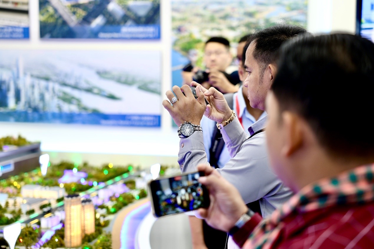 Reporters from Lancang-Mekong countries take photos in front of a scale model at the China Energy Engineering Corporation exhibition hall in Beijing on June 28, 2023. (People’s Daily Online/Li Shiqi)