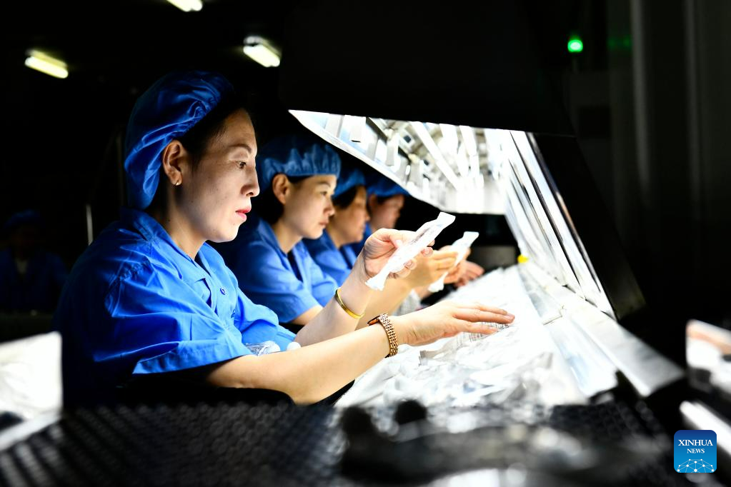 Staff members perform quality check on medical injections at a workshop in Rizhao Hi-Tech Industrial Development Zone of Rizhao City, east China's Shandong Province, June 29, 2023. (Xinhua/Guo Xulei)