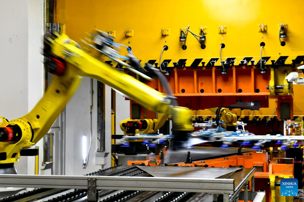 This photo taken on June 29, 2023 shows an industrial robot processing auto parts at carmaker ZXAUTO in Rizhao Hi-Tech Industrial Development Zone of Rizhao City, east China's Shandong Province. (Xinhua/Guo Xulei)