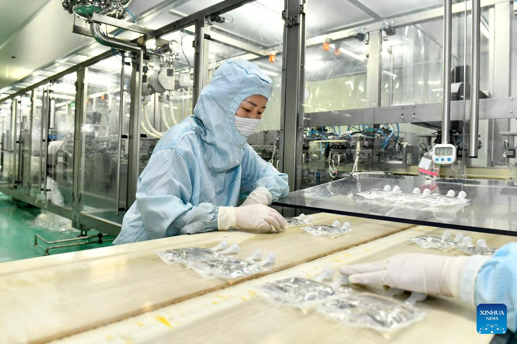 A staff member works on the production line of medical injections at a pharmaceutical company in Rizhao Hi-Tech Industrial Development Zone of Rizhao City, east China's Shandong Province, June 29, 2023. (Xinhua/Guo Xulei)