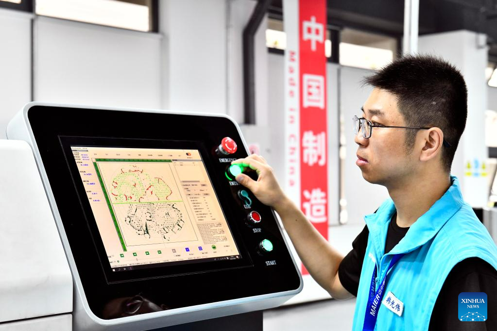 A staff member operates a machine to make dentures at an industrial park in Rizhao Hi-Tech Industrial Development Zone of Rizhao City, east China's Shandong Province, June 29, 2023. (Xinhua/Guo Xulei)