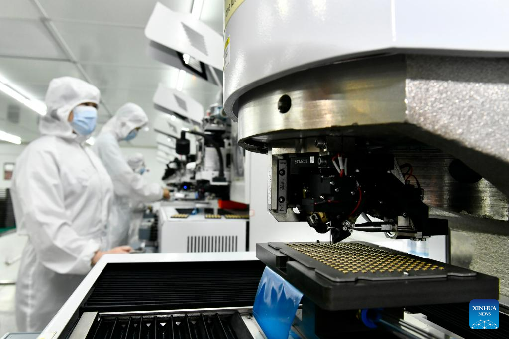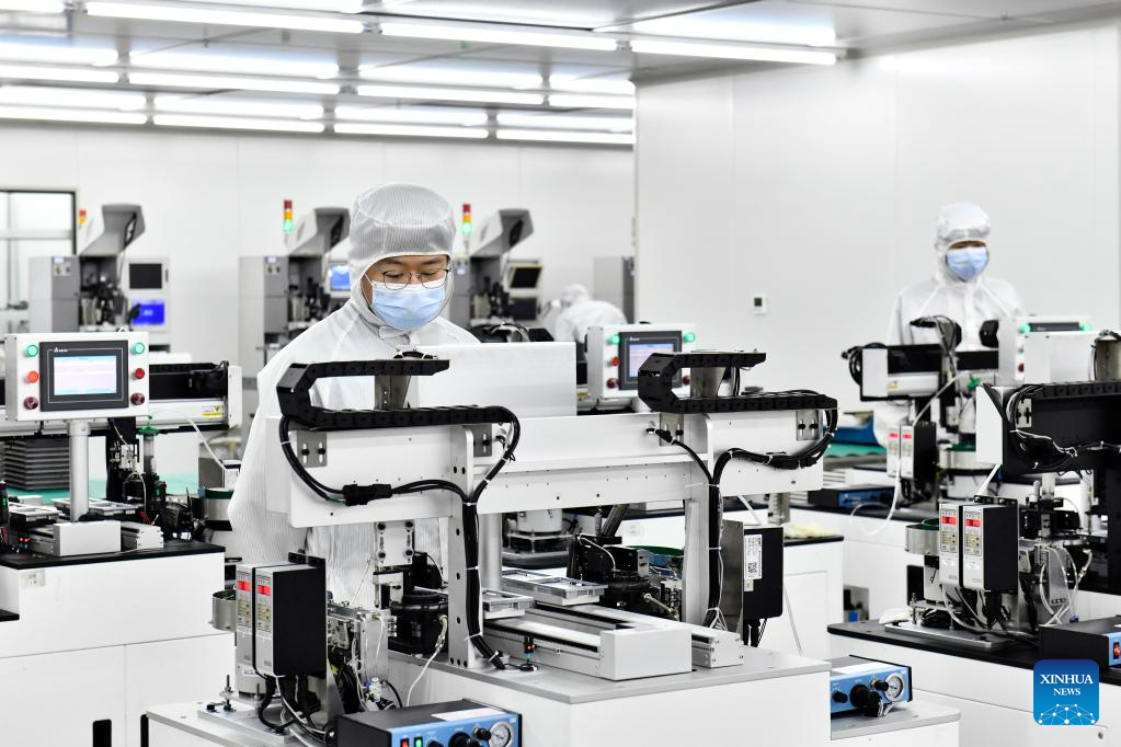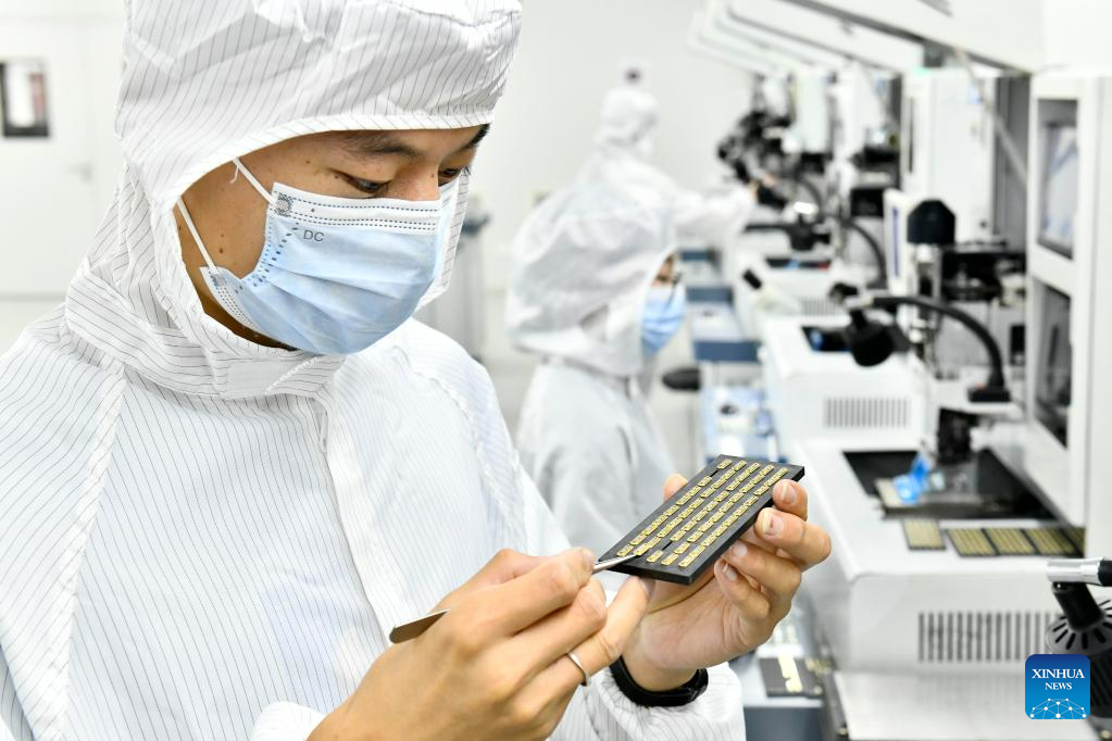 A staff member makes surface acoustic wave filters at an industrial park in Rizhao Hi-Tech Industrial Development Zone of Rizhao City, east China's Shandong Province, June 29, 2023. (Xinhua/Guo Xulei)