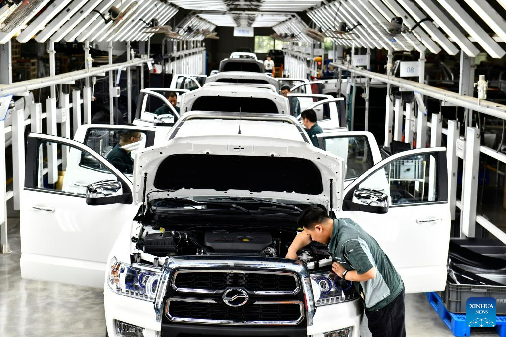 Staff members work on an assembly line at carmaker ZXAUTO in Rizhao Hi-Tech Industrial Development Zone of Rizhao City, east China's Shandong Province, June 29, 2023. (Xinhua/Guo Xulei)