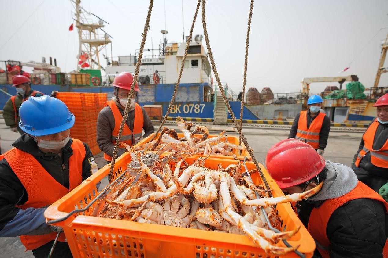 King crabs are unloaded from a ship at a port in Yantai, east China's Shandong province. (People's Daily Online/Tang Ke)