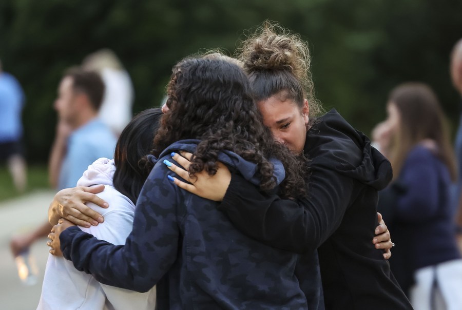Teens comfort each other by hugging after a prayer vigil in Highland Park, suburb of Chicago, Illinois, the United States, July 5, 2022. People held mourning services for a mass shooting during an Independence Day parade in downtown Highland Park on July 4.(Photo by Joel Lerner/Xinhua)
