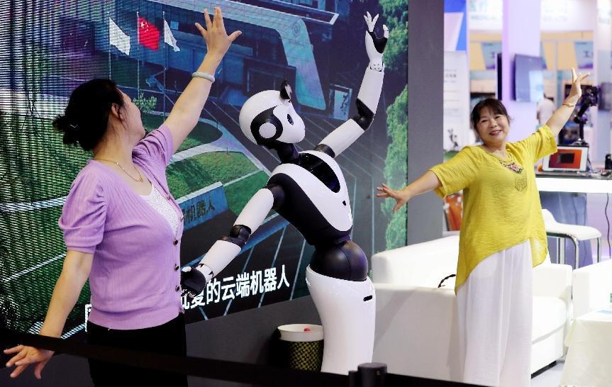 Citizens dance with a robot at the 2023 Global AI Product and Application Expo in Suzhou, east China's Jiangsu province, June 25, 2023. (Photo by Hua Xuegen/People's Daily)