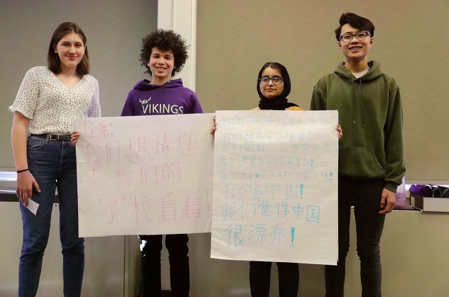 Students from Niles North High School show the placards written in Chinese to express their feelings about receiving a letter from Chinese President Xi Jinping in Illinois state, the United States, April 3, 2019. (Xinhua/Wang Ping)