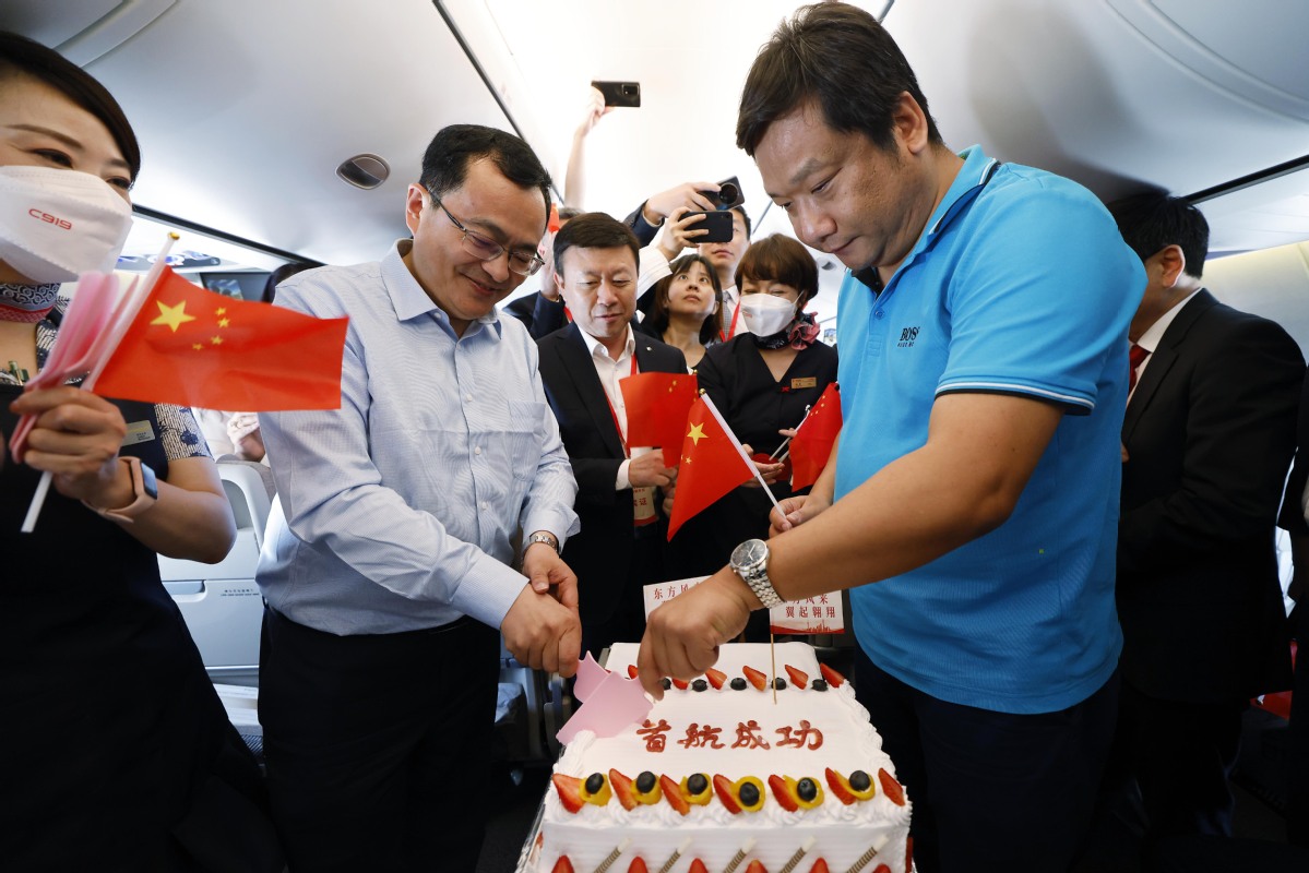 Passengers onboard cut a cake to celebrate the first commercial flight of the C919, operated by China Eastern Airlines, from Shanghai to Beijing on May 28. YIN LIQIN/CHINA NEWS SERVICE