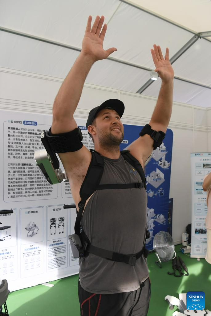 A man tries an exoskeleton robot in Victoria Park of Hong Kong, south China, July 1, 2023. (Xinhua/Chen Duo)