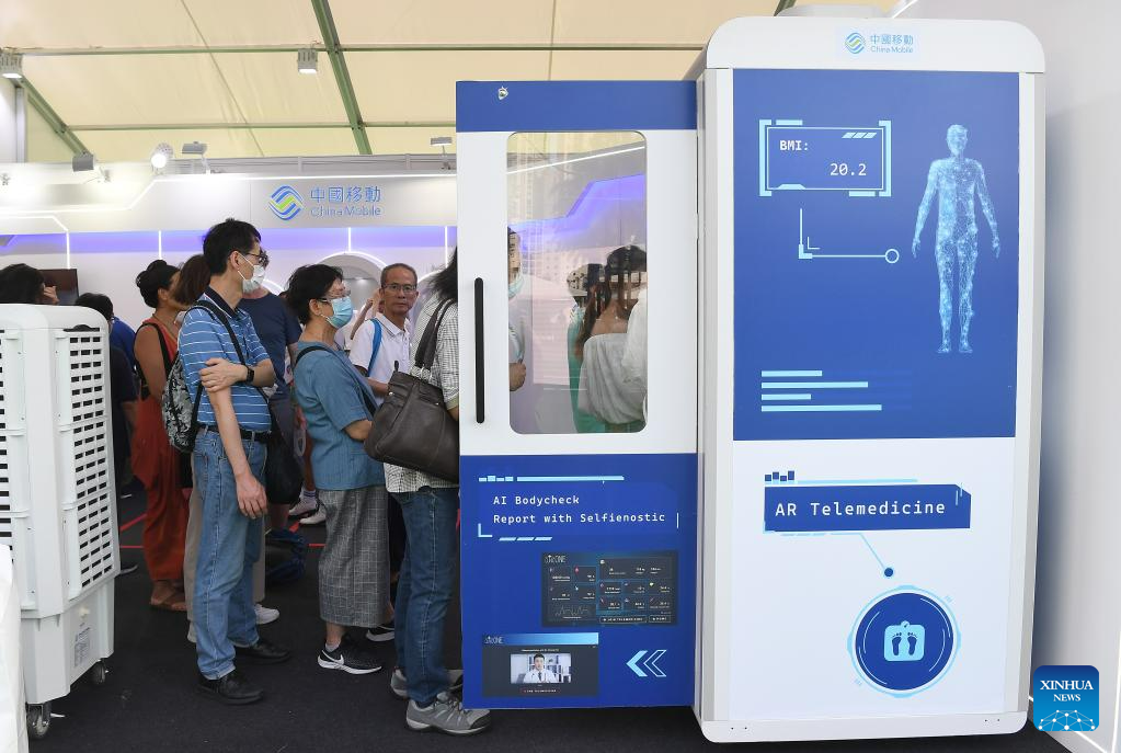 People wait in line to try a health monitoring stand at the booth of China Mobile Hong Kong in Victoria Park of Hong Kong, south China, July 1, 2023. (Xinhua/Chen Duo)