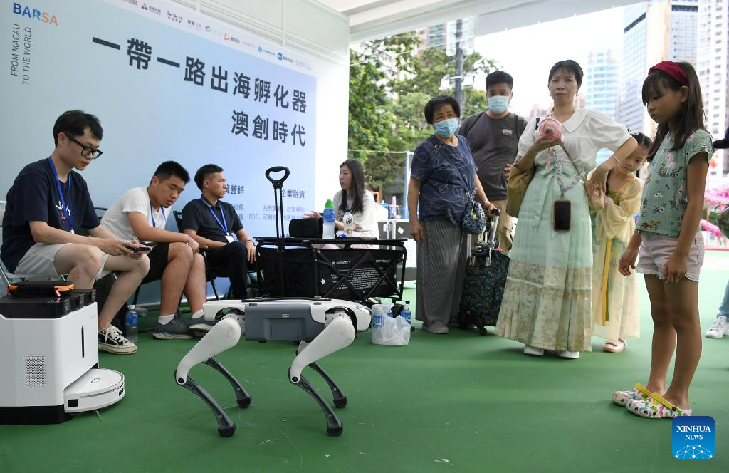 A staff member of the Macao-based Belt and Road Startup Accelerator demonstrates a mechanical dog in Victoria Park of Hong Kong, south China, July 1, 2023. (Xinhua/Chen Duo)