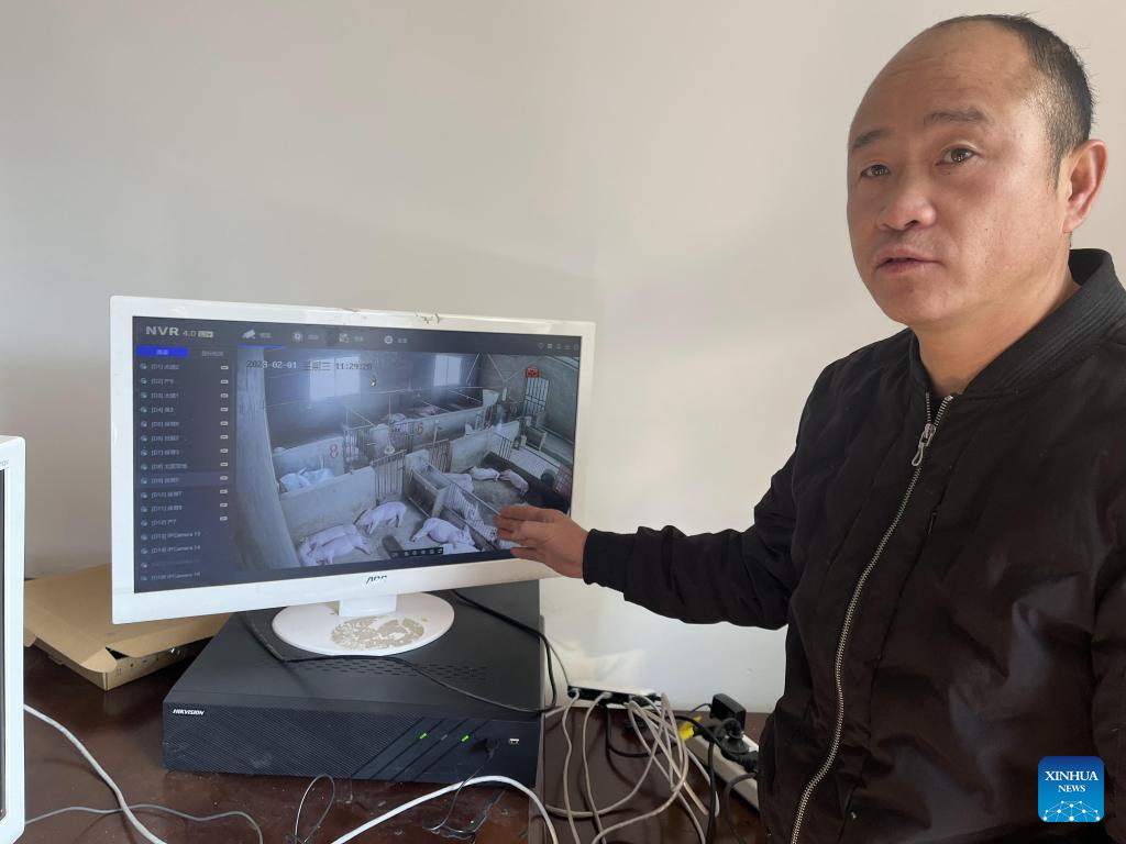 He Xikang monitors the growth of pigs through an online platform at a pig farm in Gantang Village of southwest China's Guizhou Province, Feb. 1, 2023. (Xinhua/Li Jingya)