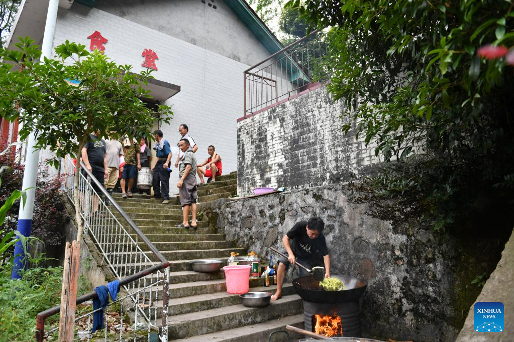 Villagers gather to have meals at a school in Caotan Village of Yantouzhai Town, Guzhang County of Xiangxi Tujia and Miao Autonomous Prefecture, central China's Hunan Province, July 2, 2023.?With the flood gradually receding, the cadres and masses in the affected areas are working hard to ensure the basic needs of the affected people. (Xinhua/Chen Zhenhai)