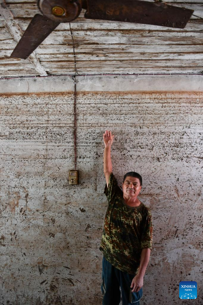 A villager points out the traces left after the flood in his house in Caotan Village of Yantouzhai Town, Guzhang County of Xiangxi Tujia and Miao Autonomous Prefecture, central China's Hunan Province, July 2, 2023.?With the flood gradually receding, the cadres and masses in the affected areas are working hard to ensure the basic needs of the affected people. (Xinhua/Chen Zhenhai)
