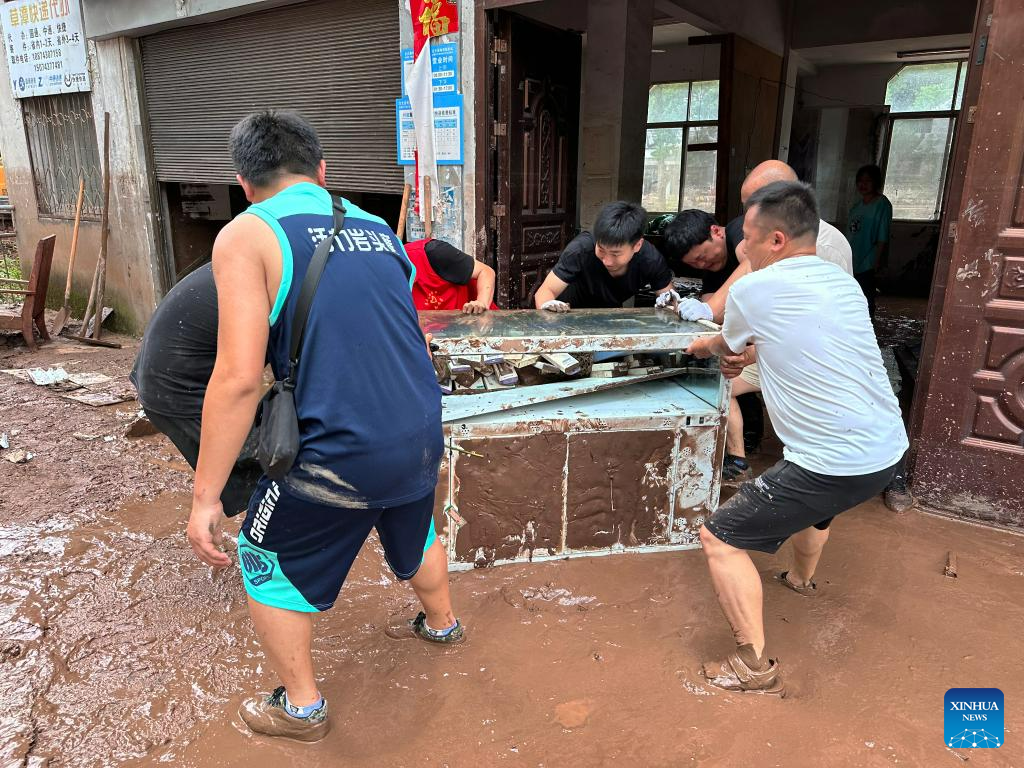 Volunteers help villagers clean up damaged furniture in Caotan Village of Yantouzhai Town, Guzhang County of Xiangxi Tujia and Miao Autonomous Prefecture, central China's Hunan Province, July 2, 2023.?With the flood gradually receding, the cadres and masses in the affected areas are working hard to ensure the basic needs of the affected people. (Xinhua/Xie Ben)