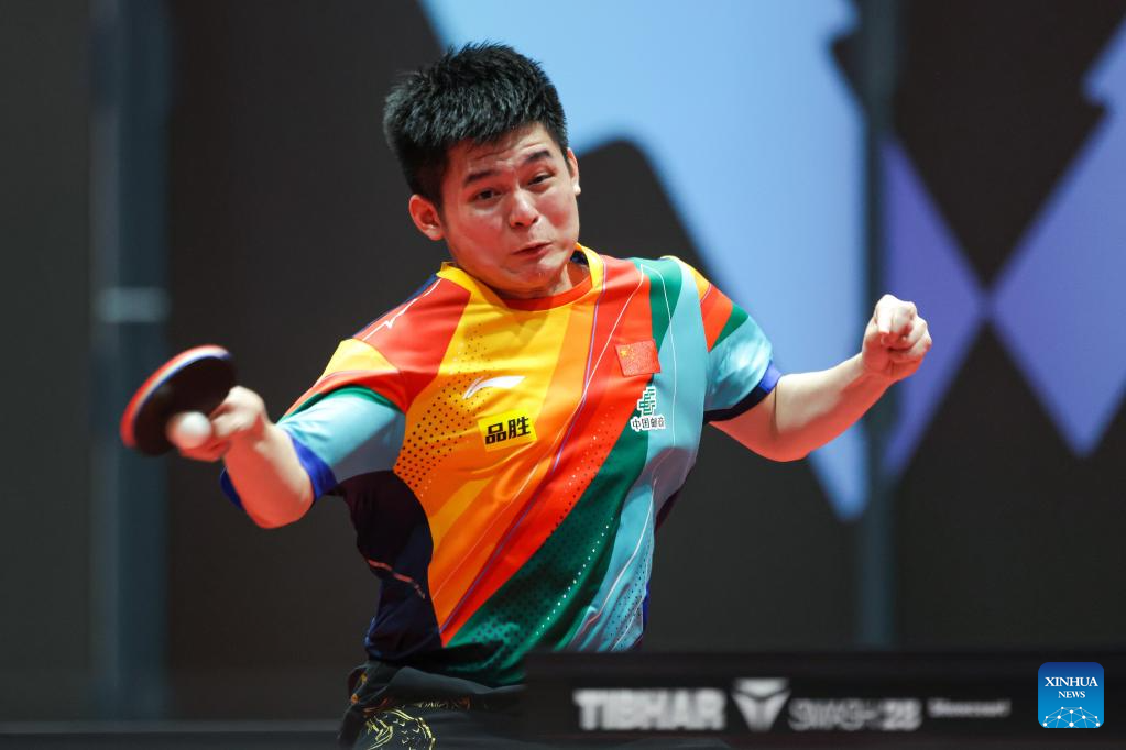 Xiang Peng of China competes during men's singles semifinal match against his teammate Lin Gaoyuan at the 2023 World Table Tennis (WTT) Contender Zagreb in Zagreb, Croatia, on July 1, 2023. (Photo by Luka Stanzl/PIXSELL via Xinhua)