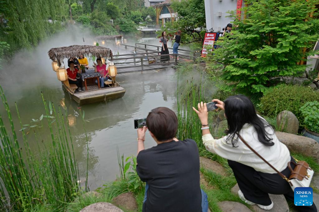 Tourists take photos at a restaurant in Hengshanwu Village in Anji County, east China's Zhejiang Province, June 5, 2023. (Xinhua/Cai Yang)