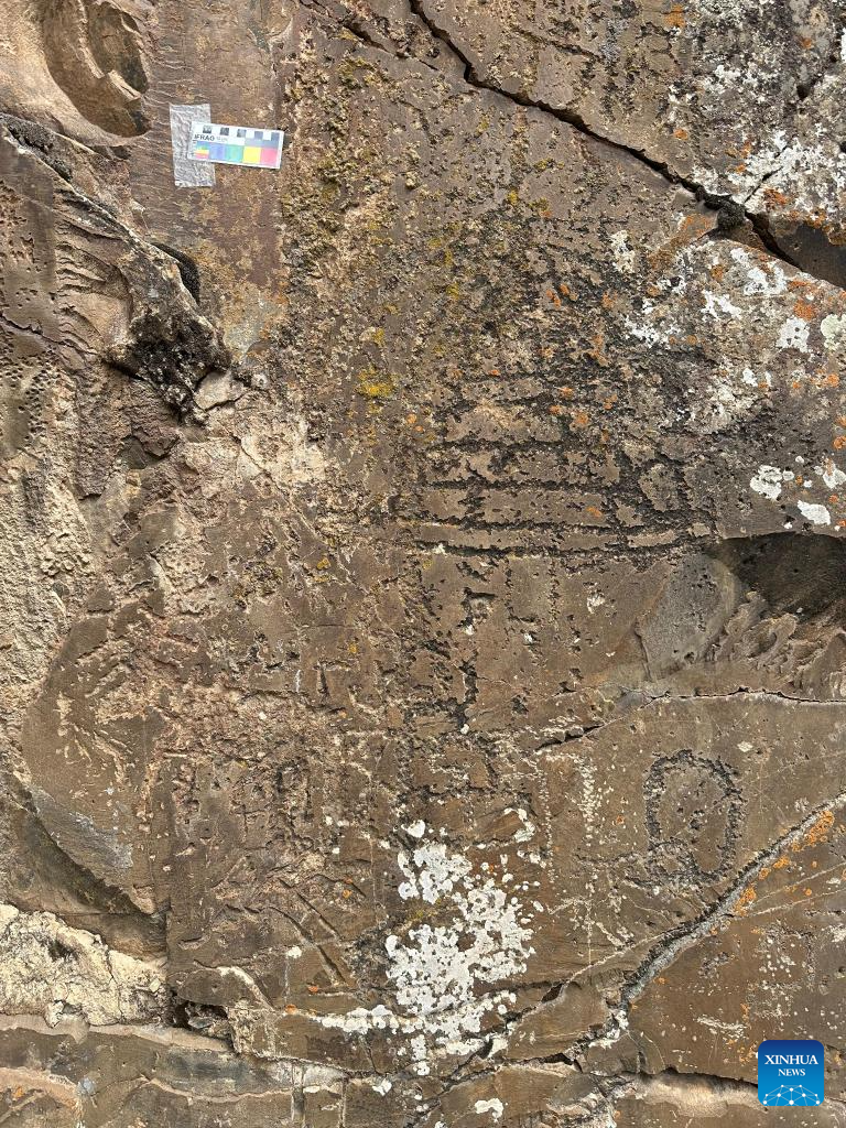 This photo taken on June 26, 2023 shows a rock painting found in the Tongtian River basin in the source area of the Yangtze River in northwest China's Qinghai Province. (Yushu research institute of history and culture/Handout via Xinhua)