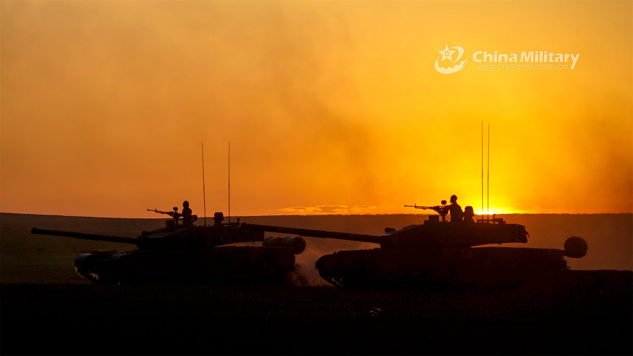 Main battle tanks (MBTs) attached to a brigade under the PLA 82nd Group Army move forward under the sunset during a maneuvering training exercise in the Gobi desert in late June, 2023. (eng.chinamil.com.cn/Photo by Sun Tongkai)