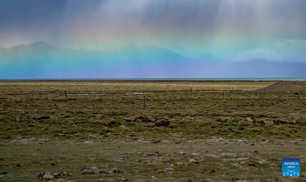 This photo taken on July 4, 2023 shows a rainbow near the Puma Yumco Lake in Nagarze County of Shannan, southwest China's Tibet Autonomous Region. (Xinhua/Sun Fei)