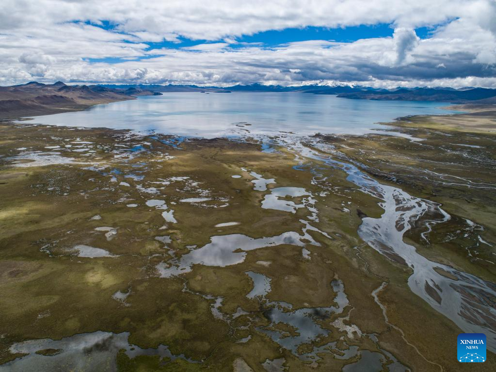 This aerial photo taken on July 4, 2023 shows a view of the wetland by the Puma Yumco Lake in Nagarze County of Shannan, southwest China's Tibet Autonomous Region. (Xinhua/Sun Fei)